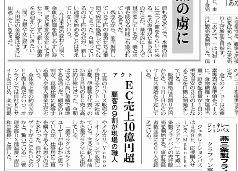 記事内では、アクトツールのネット販売(EC)が年間売上10億円を突破した背景について取り上げられています。